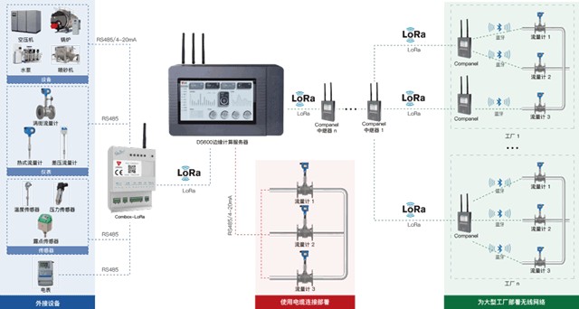局域网边缘计算/智慧气体能源管理系统是基于采集的流量、温度、压力、露点、电量等测量数据以及空压机、风机、锅炉、水泵、砂机、干燥机等设备的运行数据,运用人工智能(AI)能源优化计算技术,可完成能效分析、运行状态监测、统计分析报表以及数据的展示、导出等。在大规模工厂内,可通过LoRa中继完成多设备远距离级联,实现全工厂测量和设备运行数据传输。